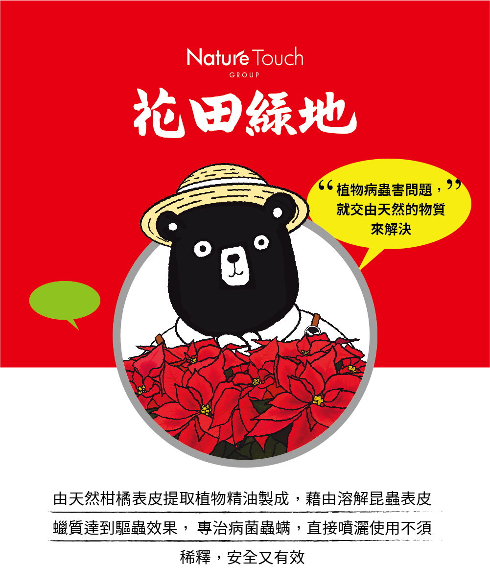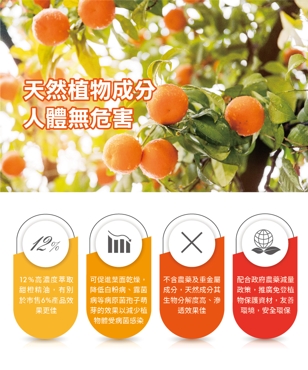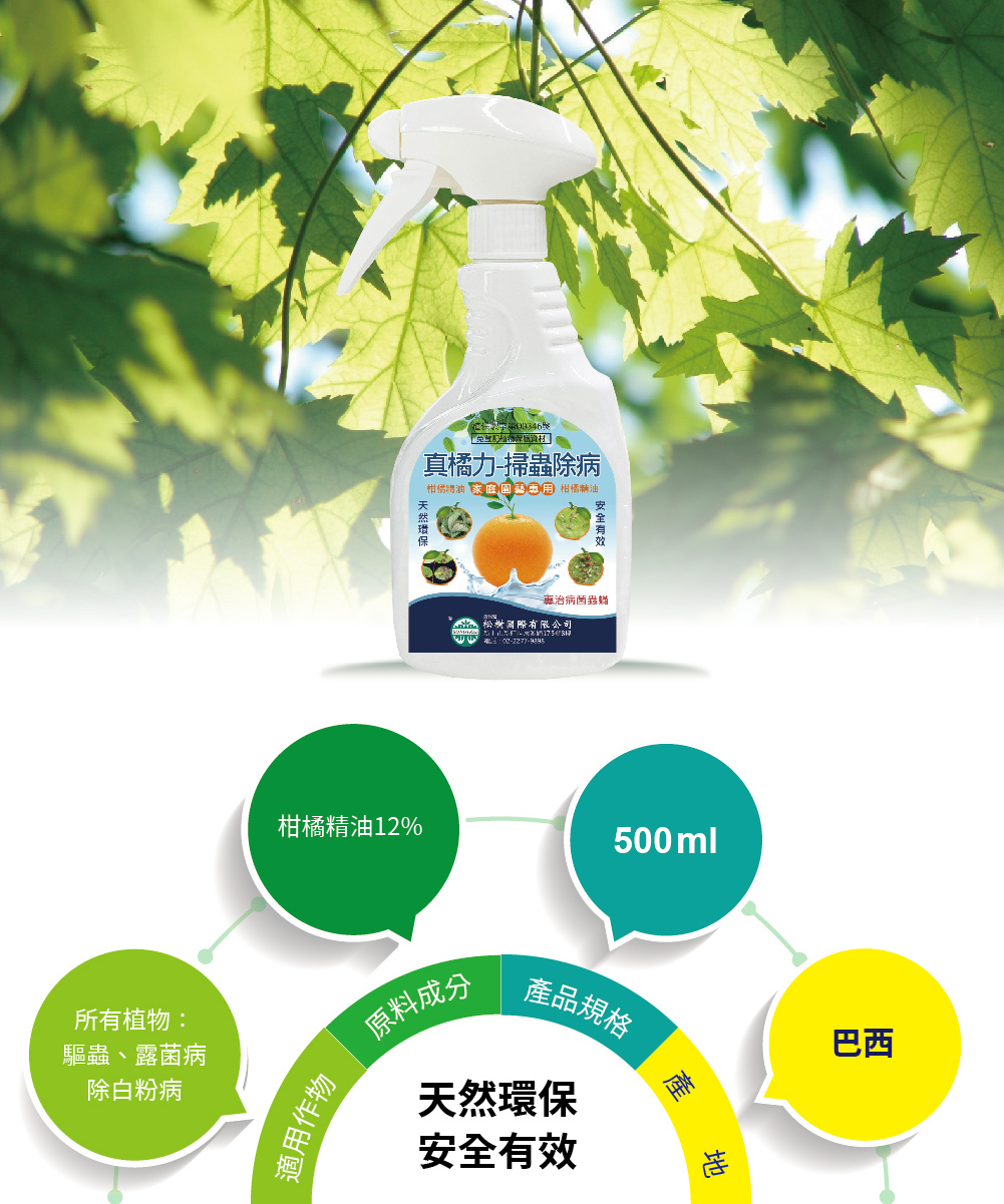 由天然柑橘表皮提取植物精油製成,藉由溶解昆蟲表皮蠟質達到驅蟲效果, 專治病菌蟲螨,直接噴灑使用不須稀釋,安全又有效。
