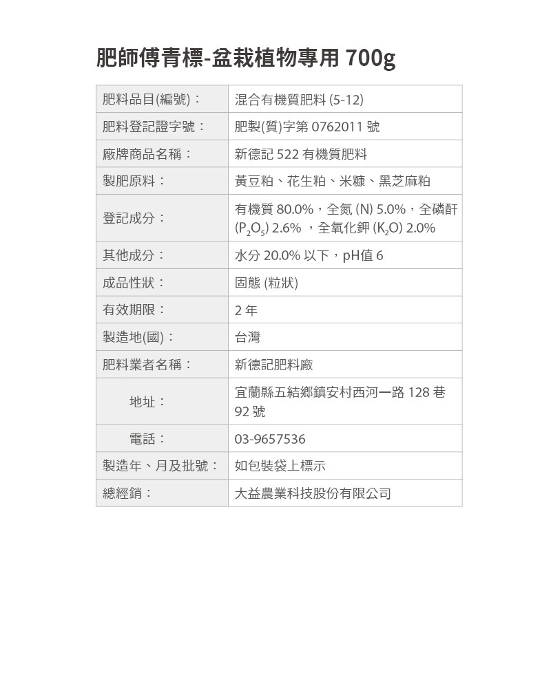 「根據植物栽培的需求,肥師傅精選多種天然動物性與植物性有機質材料,並使用獨門的傳統製肥工藝,而誔生的特製有機質肥料,是有機且乾淨的新選擇。」