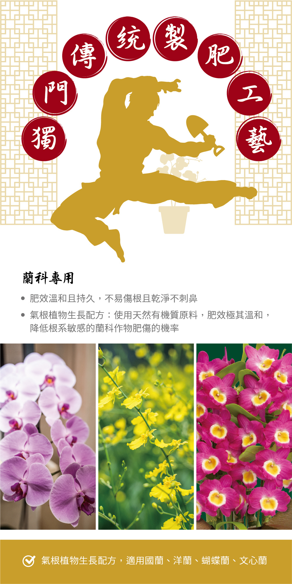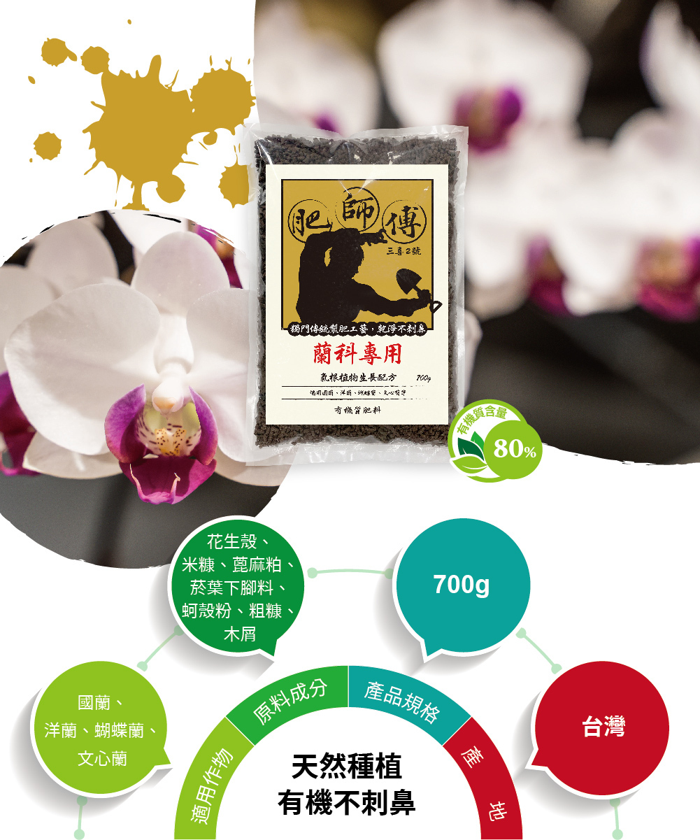 氣根植物生長配方:天然有機質原料,肥效極溫和,降低根系敏感蘭科作物肥傷的機率 。