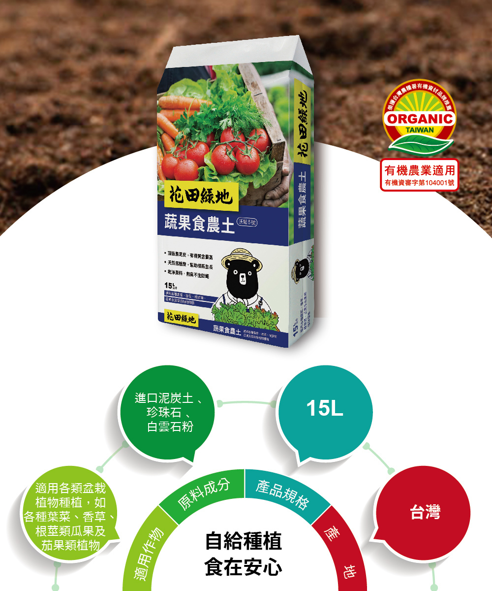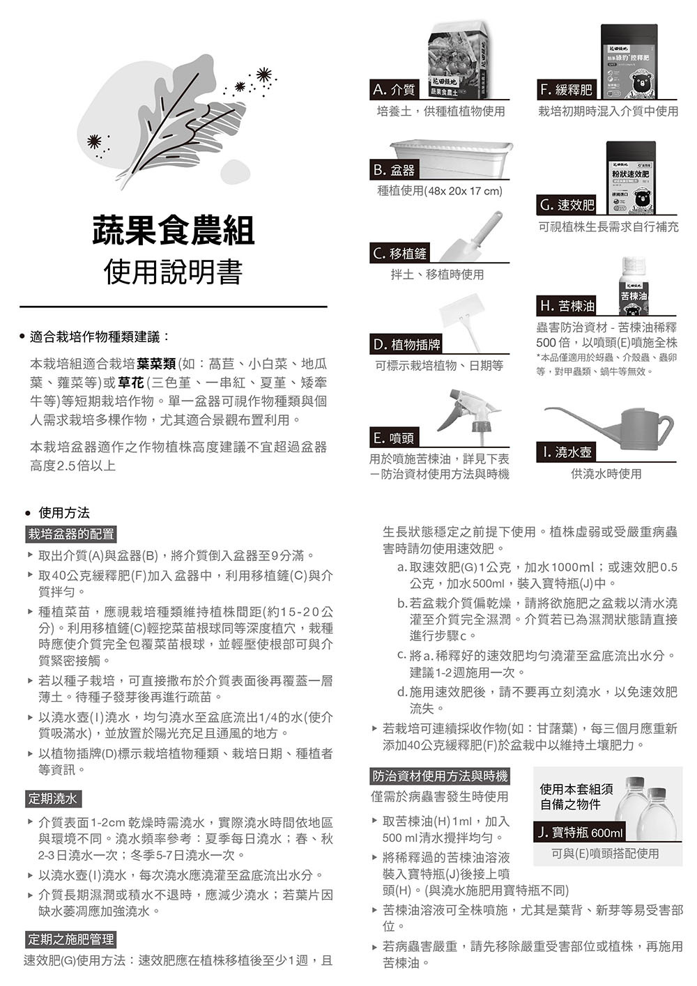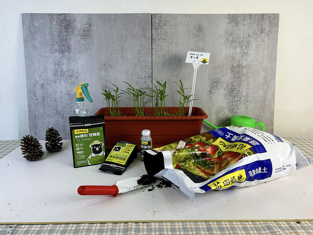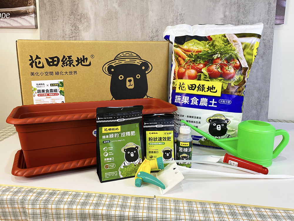 蔬果食農組提供「全套栽培時所需之資材」(all in one),內含資材一應俱全(包括盆器、介質、移植鏟、植物插牌、澆水壺、噴頭、速效肥、緩釋肥、苦棟油),適合食農體驗教學需求,免除講師需為教學備課四處訂購資材又可能購入不適用產品之風險;利於食農體驗教學順利進行,有效提高栽培成功率,提升學員成就感並增進食農教育之推廣效果。