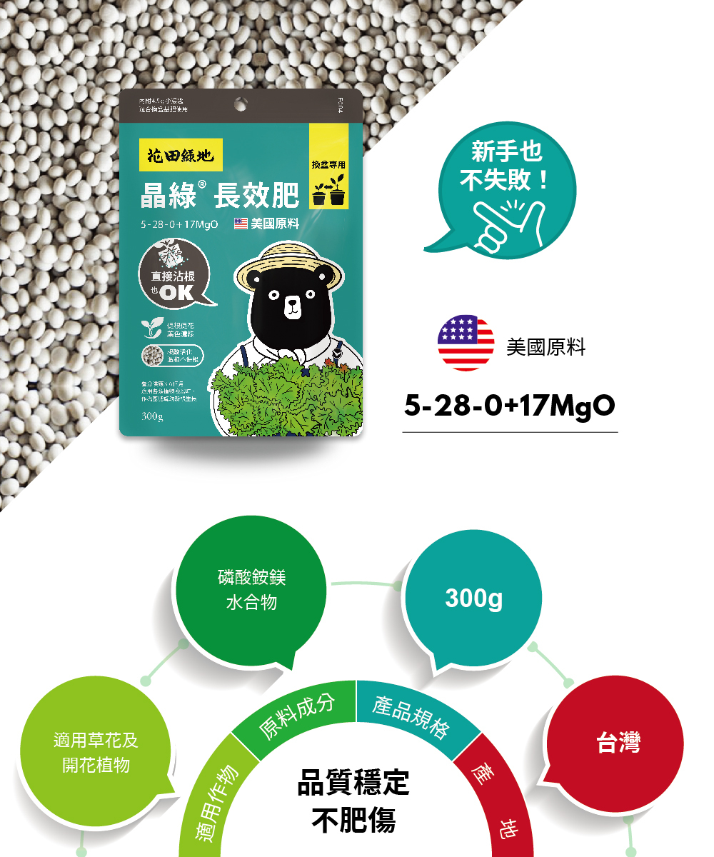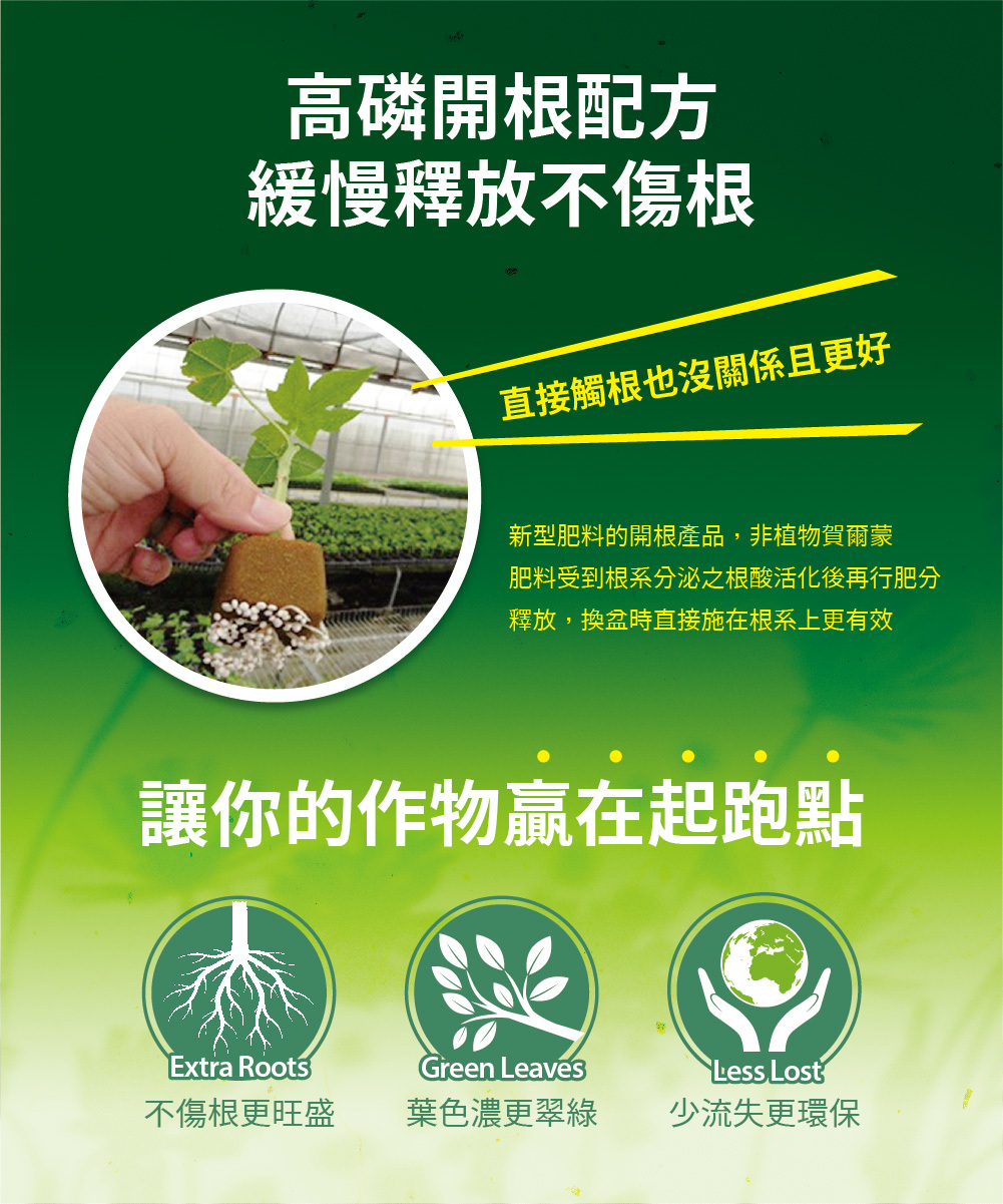 新型緩釋型磷肥,受到根系分泌之根酸活化後再行肥分釋放,安全不肥傷。