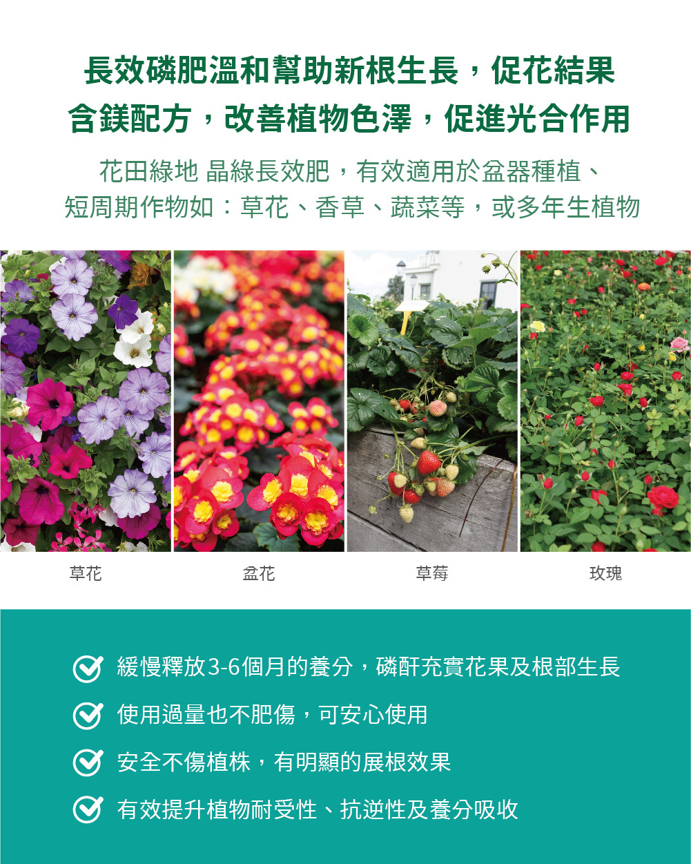 可促進根系發展,促花結果,另含鎂元素可改善植物色澤。