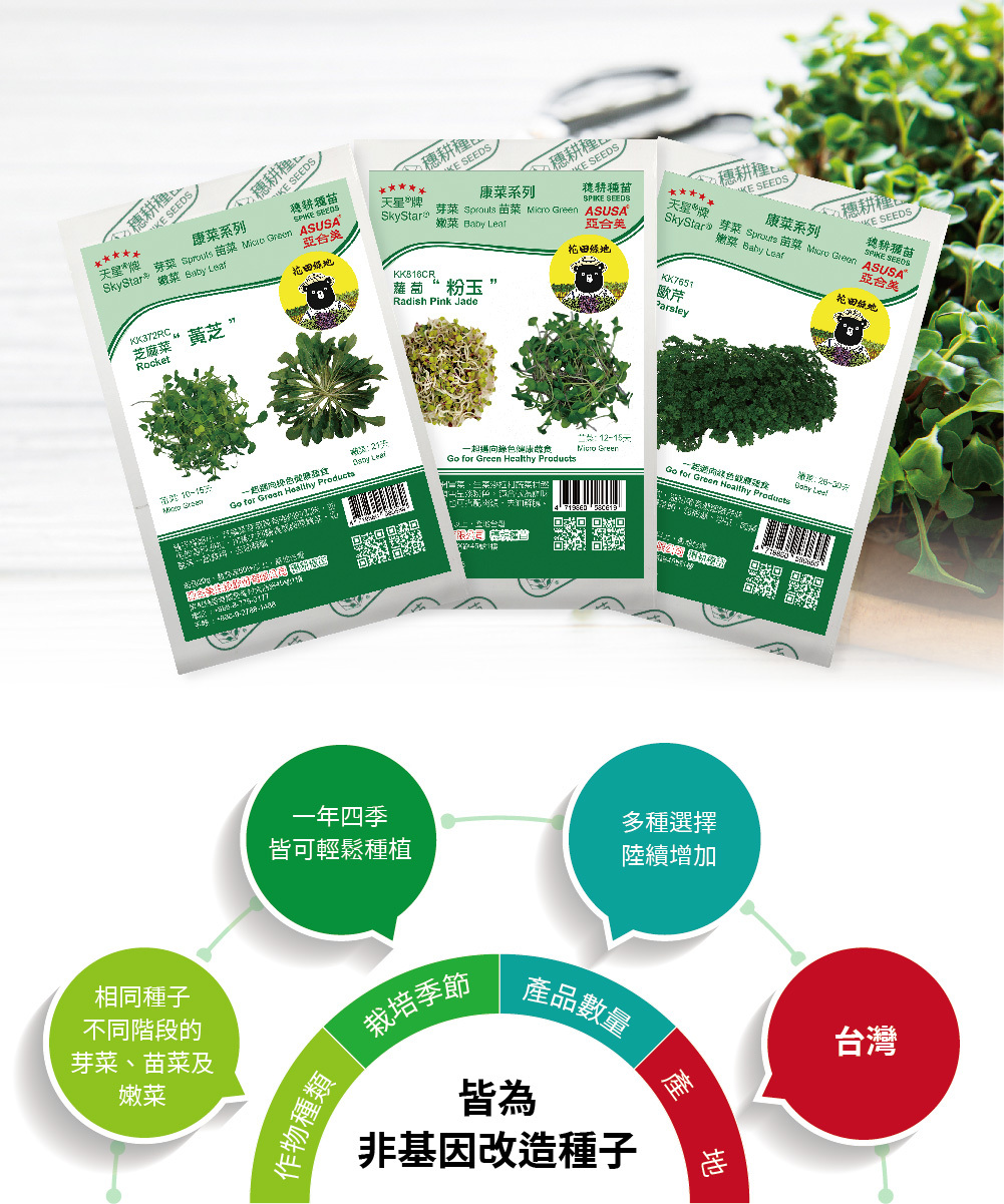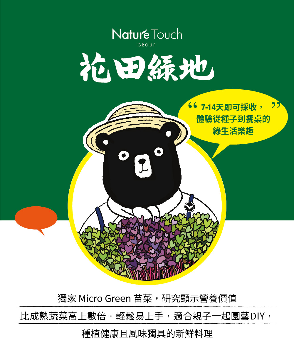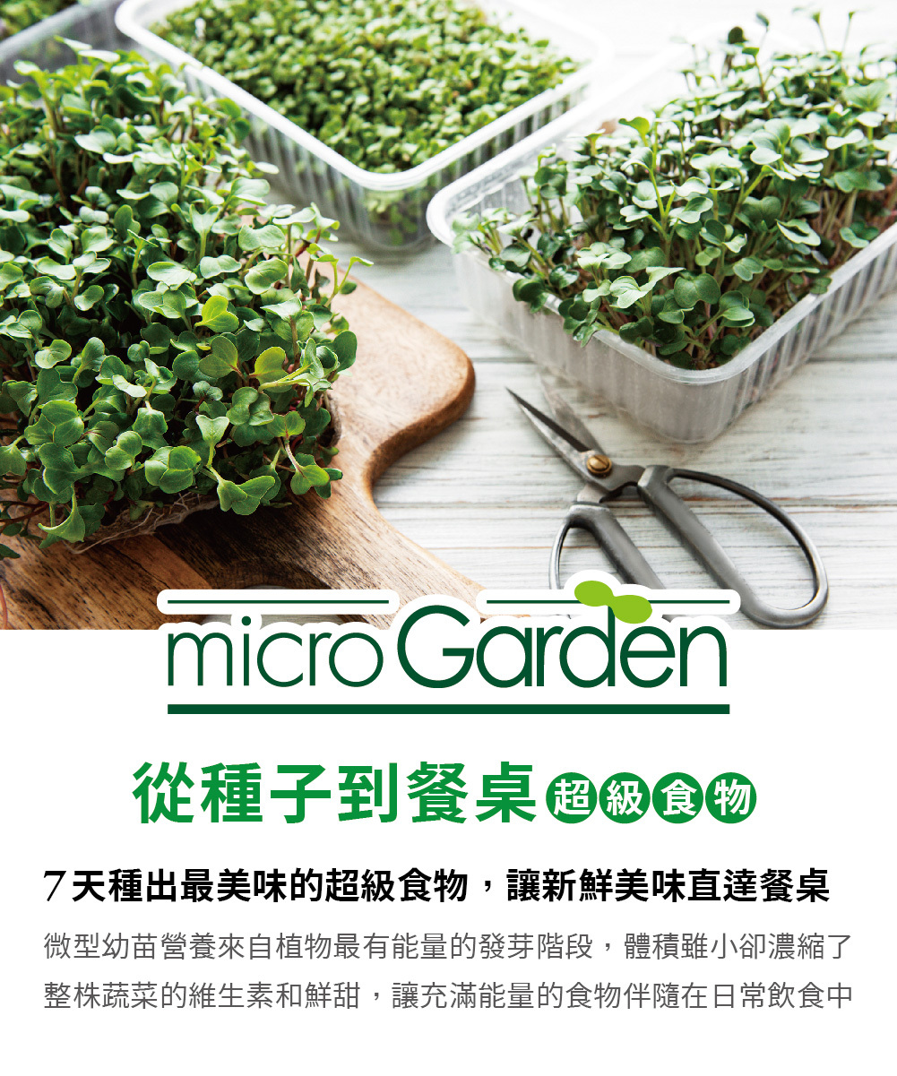 種子發芽與生產初期的階段,是一株植物最有能量的時刻,體積雖小但卻濃縮了整株蔬菜的維生素和鮮甜,被稱為21世紀令人驚豔的超級新食材,具高營養價值及獨特風味。且只需幾平方公分大小,室內半日照或陽台全日照環境,很適合家庭全年種植。