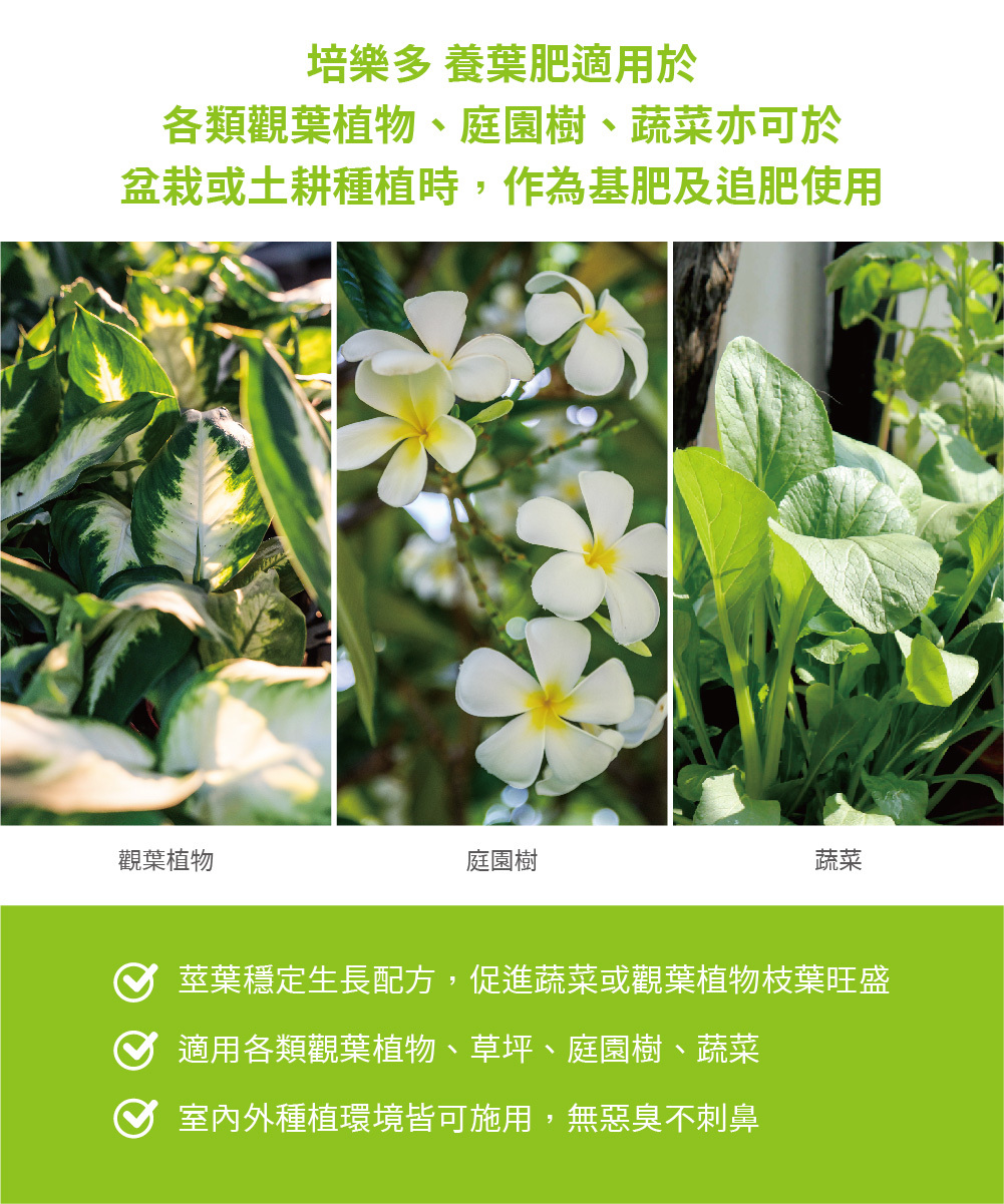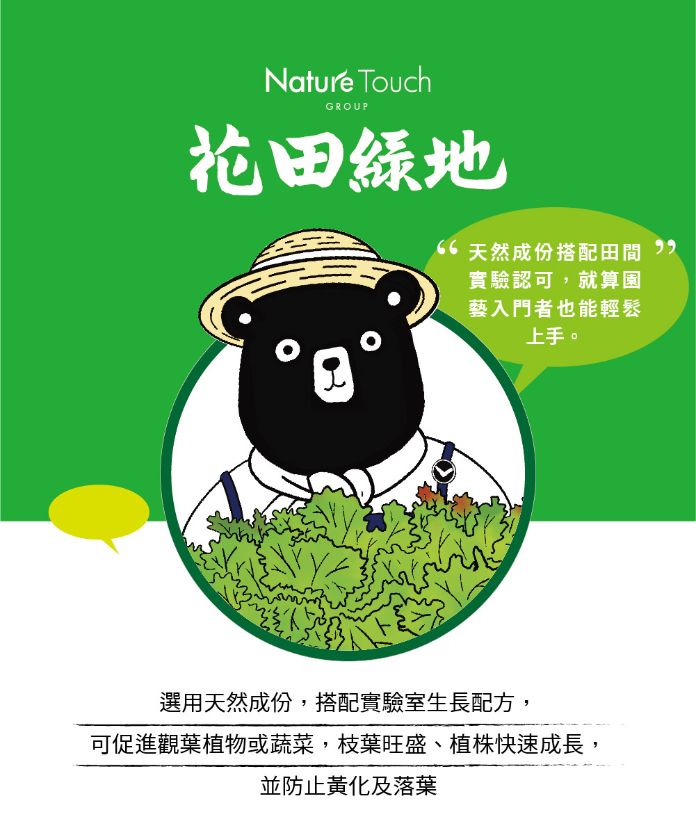 「選用約天然成份,搭配實驗室生長配方,可促進觀葉植物或蔬菜,枝葉旺盛、植株快速成長,並防止黃化及落葉。就算零基礎的園藝入門者,也能輕䯳上手。」