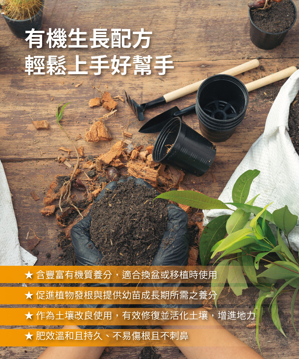 含豐富有機質養分,適合換盆或移植時使用,可促進植物發根與提供幼苗成長期所需之養分。