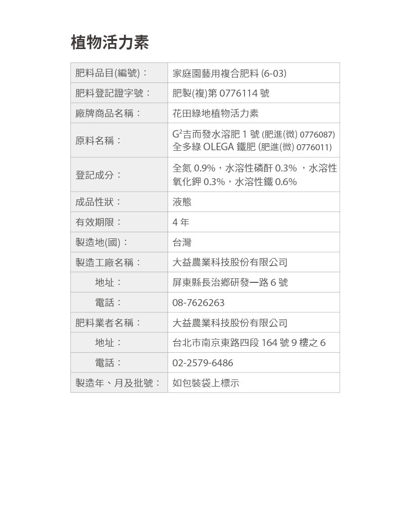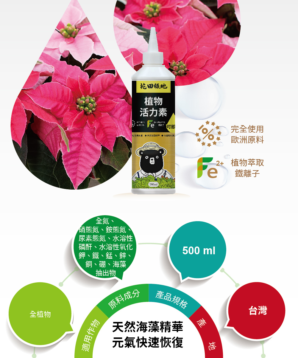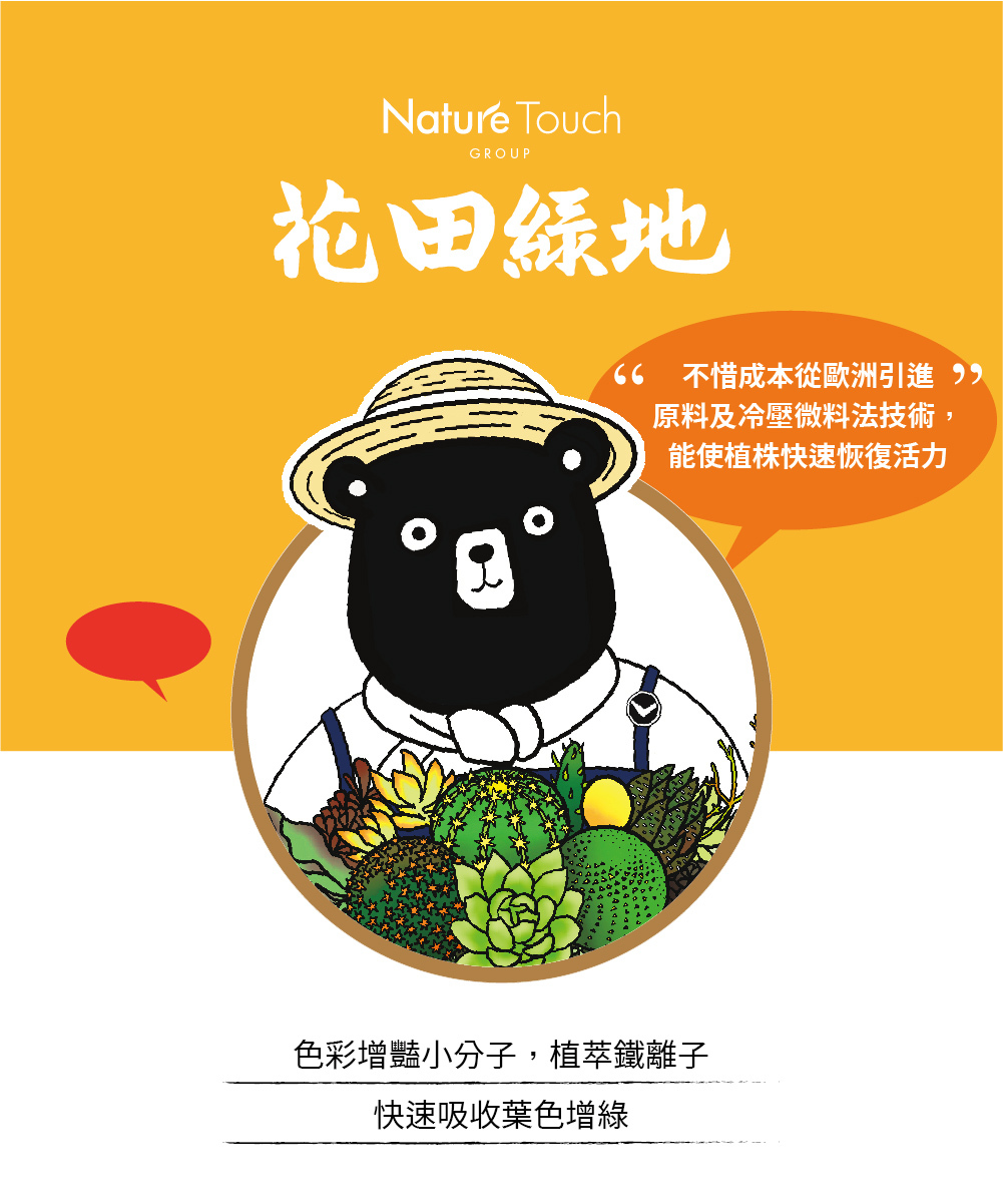 「不惜成本從歐洲引進原料及冷壓微料法技術,使用色彩增豔小分子,能使植株快速恢復活力。」